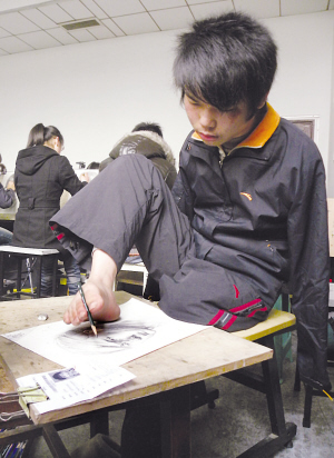 连日来,在南通大学文峰校区普通高校艺术类单招考场上,他在寒风中穿梭于各高校考场,已经参加了4所省外艺术院校的专业考试。他一蹦一跳中,空荡荡的袖管和裤筒在寒风中摇曳,总是引来无数人心酸的热泪以及由衷的敬佩。