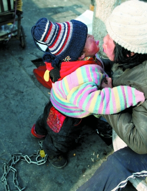 昨日,房山良乡华冠购物中心西侧,陈传六正在趴活,脸上有多处冻疮。距摩的两米远的路牌子下铺着纸板,放着简易童车。他两岁的儿子坐在纸板上喝着冷奶,奶嘴发黑。一名黑车司机朝小孩喊“金蛋儿”,小孩朝他笑。