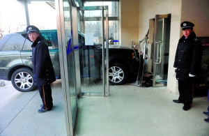 昨日下午4时许,京版信息港写字楼前,一辆路虎越野车骑在大楼入口处,车身只有擦痕,四周散落着铝合金框架和玻璃碎片,写字楼大门已经被撞碎了一半。