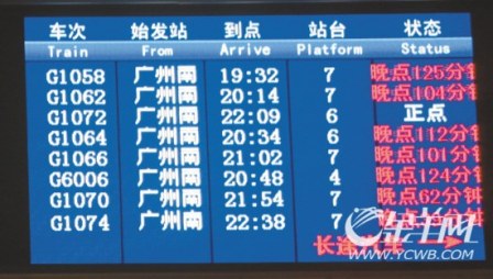 到晚上6时30分,现场LED显示屏显示,从原定下午5时06分发出的9个班次列车都处于晚点状态中,车站所有站台上都没有列车停靠,数千旅客因此滞留广州南站内。