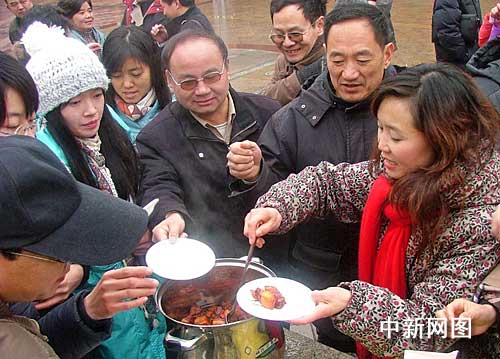 何慧丽将自然养殖生产的猪肉加工成红烧肉免费让郑州市民品尝。