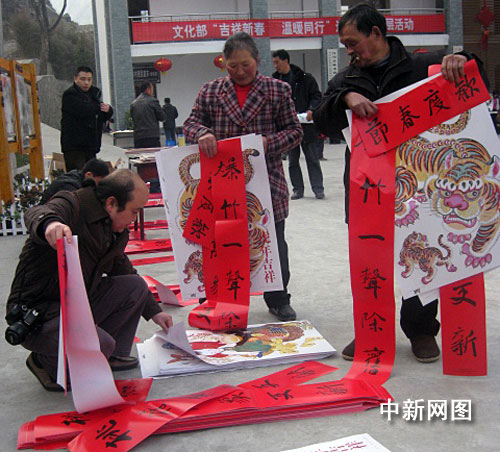 中新网映秀2月9日电(刘忠俊 王程)2日8日,文化部“吉祥新春,温暖同行” 送春联年画下基层活动在“5.12”震中映秀镇老街村村民活动中心广场举行。