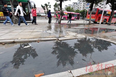 昨天下午,记者在现场看到,水坑大约有十几平方米,隐隐有酸臭味扑面而来。“这几天刚下过雨,气味已经好了很多。”业主周先生 说,年前气温高的那两三天,臭味能熏到三四十米开外的楼层,许多住户大热天不敢开窗。记者注意到,这个水坑正好位于108公交车的终点站,距离站牌不过三四米。因此,附近居民等车时,不得不挨着水坑,碰到上下班高峰期,常有人被挤到坑里,弄得一身酸臭。
