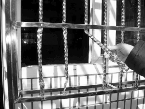 201室的曹先生家,朝南的一扇窗户外,两根竖的不锈钢条也被弄断往上折,小偷从这个洞钻了进来。为了爬上2楼,小偷将高至2楼的底楼天井的金属围栏弄折,并踩弯了钢管。
