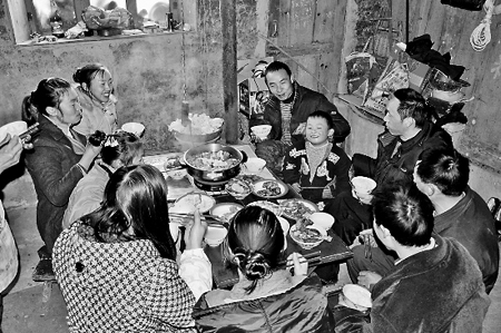 “快点烤一会儿再去泡个热水澡。你娃儿他妈老早就给你烧好了洗澡水。完了出来吃团年饭,我们一直在等你。”老父亲帮谭崇文一边卸着包袱一边说。
