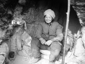 井陉县天长镇郝家窑村,距井陉县城15公里,是个宁静祥和的小山村。在村西北山上,有一个小山洞。昨日上午10时,记者看到,这个山洞很小,仅容一个人安身,地上铺有一层编织袋,上面放着两个袋子,别无他物。一位老人正在山洞里缝补破旧的衣服,一只野猫趴在灶台前,吃着碗里的馒头渣。
