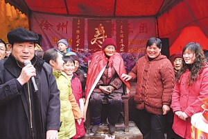 4日上午11点18分,在一阵劈里啪啦的鞭炮声中,寿星姚刘氏在子孙们的搀扶下来到寿台前。老太太身上披着大红的披风,里面穿着紫红色镶暗花对襟上衣,显得特别精神。司仪让其后辈点燃两个大大的寿烛,拜寿仪式正式开始。