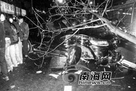 据目击群众介绍:当时这辆越野车从五指山路一单位开出来,越道冲到马路对面“新香梅休闲中心”前的人行道上来。当时正在清扫马路的一名女清洁工急忙闪到一边,她清运垃圾的拖车被这辆越野车撞翻在地,车被撞散架,整车的垃圾全部倒了出来。接着,这辆越野车撞断人行道上的一棵碗口粗的遮荫树,把停在人行道上2辆摩托车撞倒后,并没有停下来,它沿着人行道往前冲,冲出50多米远后,又在芳草园前面的人行道上撞破了一处墙角,撞倒了5辆停放好的摩托车,并把一棵碗口粗的遮荫树撞断后连根带走,还把路边一位准备骑电动摩托车的男子撞飞。肇事车接着从人行道开到五指山路上后,汽车的右前轮拐断倒向一边,开不动后才停下来。从这辆肇事车上随后下来几名男子。交警赶到现场后,把肇事司机带到了交警事故处理车上。那名被撞伤的男子随后被120救护车送往医院。