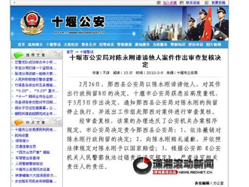 今日零点(3月10日),潇湘晨报滚动新闻记者在湖北省十堰市公安局官方网站上发现一则通告,称经复核,撤销撤销对陈永刚的拘留决定,并向陈赔礼道歉、国家赔偿,同时追究相关责任认责任。