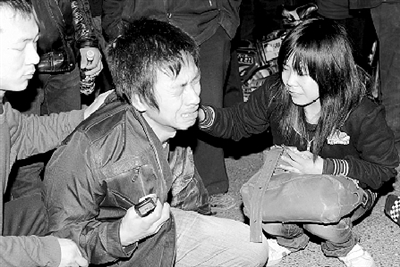 周聪飞又跪在女友身边把她的眼合上,随后把身上唯一一件外罩脱下盖住女友的脸。见他光着背,一名好心路人脱下自己的衣服给他穿上。