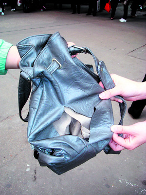 昨日,何彩久与表妹特意起了个大早,来到湘雅附一医院接受治疗。7时40分许,由于前来求诊的病人很多,肩背灰色挎包的何彩久站在人群中排队等候。“何彩久……”8时许,当值班医生喊到其名字的时候,何彩久便把挎包放下来,不料,却发现包底已被划开了一道约15厘米长的口子。