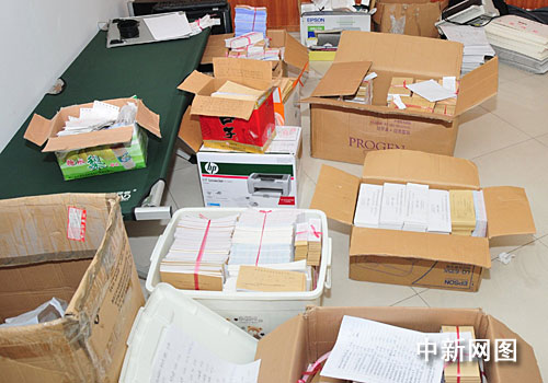 据悉,警方共奔赴13个抓捕点。记者在一个抓捕点看到,除了一张上下铺钢丝床,其余地方都被各类的纸箱占据。民警随意打开地上的纸箱,里面都是各式各样的假发票,不仅是浙江省范围内的,上海、山东、江苏等地的假发票也随地都是。经清点,民警一共缴获各类假发票21.3万份,同时还缴获了3套电脑、打印机、扫描仪等印制发票用普通设备以及400余枚开具假发票所使用的伪造公章、假证等作案工具。