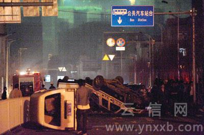 记者再次回到北仓村时,有4辆写有“综合执法”及“五华城管”等字样的车被掀翻,其中一辆在燃烧。随后赶到的消防官兵将火扑灭。