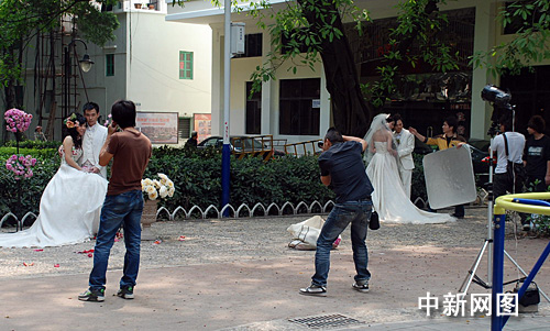 中新网广州3月29日电 题:沙面取景难度大 婚纱摄影师忙“占位”