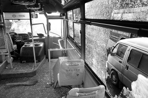 昨日17时,记者赶到现场。为了不使被砸的这辆25路公交车影响其它公交车发车,该车已经从站点移开。被砸公交车的前风挡玻璃、前车门玻璃以及车两侧近10块车玻璃被砸碎,车内满地是玻璃碎片。