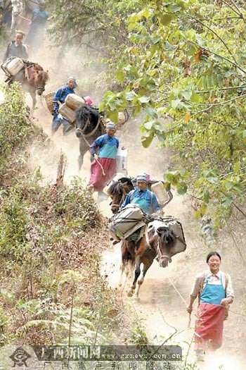 在凌云县伶站瑶族乡初化村弄料屯,有一支瑶族女子抗旱找水马帮队。据了解,自从去年10月干旱以来,这支马帮队每天牵马到距离家十几公里远的山上找水。4月1日,马帮队出动30多人共20匹马,从上午8时出发,中午12时到达该乡坟塘村。下到800多米的山谷后,终于找到了一处自然水源。