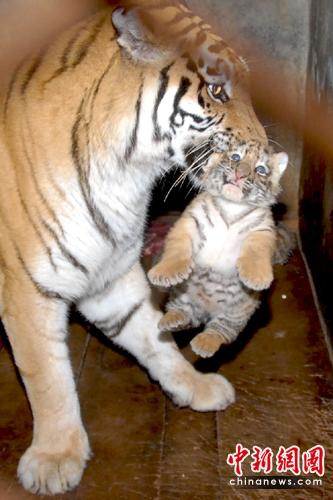 虎妈妈将顽皮的的虎宝宝叼回产房