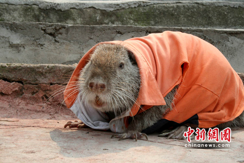 据刊登广告的人李富容先生介绍,他老家在湖北,来隐贤山庄开办爬行动物园已经有六七年时间了,那只海狸鼠是他从老家带过来的,海狸鼠从出生至今已经有10个年头了,体重也长到了近40斤,从头到尾整只海狸鼠长达90厘米,因为个头长得大,猫见了也得畏它三分。“08年该鼠曾举办过一次猫鼠大战,设擂挑战猫,结果来应战的猫都败在它的利爪之下。”李先生说。