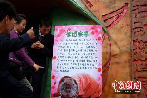 中新网东莞4月8日电(李映民 谢俊忠)“本公子名叫海狸,英文名‘Liky’,今年10岁……诚征年龄6-10岁,体重35斤以下,身体健康,靓丽、贤惠的‘女士’为伴,共同组建幸福美好家庭。”,乍一看还以为是某人的征婚广告,仔细一看却是一则为海狸鼠觅伴侣的征婚启事。广东东莞市隐贤山庄爬行动物园的主人今天为精心饲养了10年的海狸鼠打出征婚广告,欲为爱鼠寻找一“位”称心如意的伴侣,广告吸引了众多过往游客驻足观看。