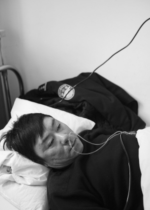 昨日10时许,记者到中日联谊医院急诊病房见到了刘勇,记者进入病房前,主治医生一再强调记者不要刺激病人,现在病人情况危急,血压一度达到217,尽量别说话,不能吃饭。