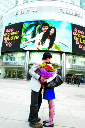 婷婷的男友田新营告诉记者,他比婷婷年长两岁,来自山东,和婷婷是通过朋友介绍认识的。当时他刚刚辞了工作,正处于事业的低谷,可是婷婷并没嫌弃,反而给了他无限的勇气,后来他找到了新工作。田新营说,半年前他就一直在想以什么方式向婷婷求婚,有一天他从这块大屏幕下路过,突然来了灵感。1个月前,他向商场请求,想通过大屏幕向女友求婚。商场觉得这是件好事儿,很爽快地答应了。于是就有了这段浪漫、温馨的求婚现场。(于海波)