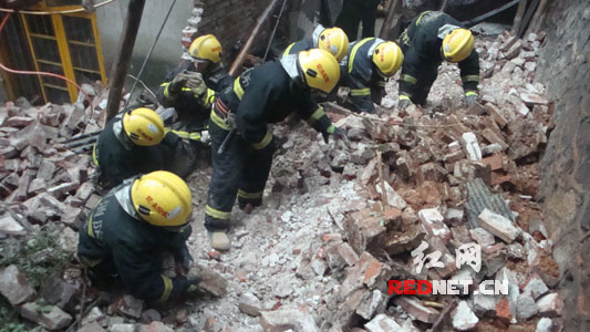 经现场侦察发现,坍塌房屋为一间砖瓦结构的仓库,由于连续暴雨,泥土松动引发山体滑坡,泥石流将房屋埋压,现场随时都有二次滑坡的可能。面对危急复杂的现场,大队指挥员果断下令指派安全员观察现场、设立安全隔离带、疏散围观群众、调集医护人员在场等候,指挥中队官兵全力搜救。三分钟后,一名被困者被成功救出并立即送往医院救治,经询问现场知情人,屋内还有一名中年男子被埋压在废墟里面,经大致排查方位,大队指挥员立即命令中队官兵进行多点作战,对重点部位进行地毯式搜救,经过消防官兵近半个小时的艰苦奋战,被困人员被成功救出。(通讯员 杨凡)