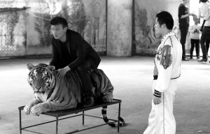 这时,在台上站着4名穿着工作服的男性工作人员,其中1人负责拍照,其他3人看守老虎,此外还有一名女性工作人员在边上帮忙吆喝并收取每次30元的合影费。