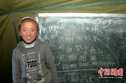 看到特警队员们搭好了帐篷、送来了水果,第二完全小学的学生们眼含泪水,激动地拍手感谢:“谢谢成都来的警察叔叔!”可爱的藏族小女孩文茂拿着粉笔在帐篷里的黑板上重重地写下“感谢警察叔叔、感谢祖国、感谢你们每个人”。正在这里学习唱歌的十七、八个3、4年级的小学生也不约而同地为特警队员表演了他们这两天才学会的歌舞——“感恩的心,感谢着你……”同时,成都特警支队的随队医生又和成都市第三人民医院的医生刘雁军一起,开了“小诊所”,为这里患病的学生进行诊治,还送上了药品和饮用水。(完)