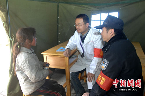 成都特警和随队医生为玉树第二完全小学的学生们看病。 作者:唐琪