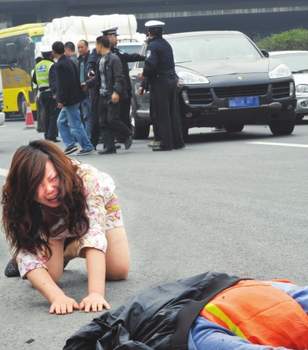 卡宴车头前10余米的右侧车道上,几个男女跪在地上,围成一圈放声痛哭。