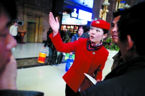 昨日,北京站,换上新装的女客运员在为旅客指路。当日,北京站和北京南站的女客运员,全部换上了“空姐式”新装,让很多乘客眼前一亮。北京站有关人士表示,此前女客运员为深蓝色大盖帽套装,此次统一换为红色掐腰上衣、黑色长裤、红礼帽、彩色丝巾。而更换新装,主要是改变乘客对客运员严肃的老印象,服装的暖色调,也可拉近乘客与客运员的距离。在更换新装的同时,火车站也将提升服务水平,为旅客提供“空乘式” 服务。本报记者 王嘉宁 刘泽宁 实习生 周琦 摄影报道