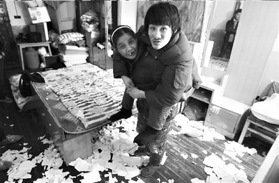 穿过安静整洁的大马路,拐进路旁的老旧居民楼,记者来到洪山区武汉汽轮发电机厂宿舍6栋。顺着黑乎乎的楼道上3楼,敲开家门,满地的白色纸屑上蹲着一个大男孩,开门的是母亲谢菊兰,个子不高,瘦瘦的,眼眶下的青黑色看上去格外明显。