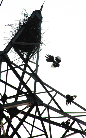 那是10天前,一对从异地飞来的凶悍八哥,竟然看好了高压电线架上的这个窝,于是不顾里面正住着的喜鹊夫妻,悍然发动攻势,冲着窝里叫唤,企图强占。但它们遭到了喜鹊的防御,一时也无可奈何。