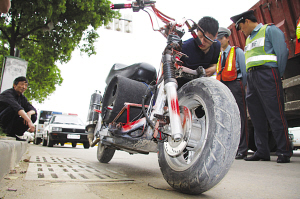 昨天中午,记者赶到查处现场时,也被这辆造型非同一般的摩托车“雷倒”了。这辆拼装摩托车从前方看,十分粗糙的钢管焊接的车龙头,外加全身毫无遮拦的车身,如同一辆被剥去外壳的电动车。说它是辆“裸体”车一点都不过分。车子的前轮和悬挂不知是哪辆小踏板摩托车的,前悬挂的减震系统倒是新的。车龙头下边的电线,也都是简单地用黑色胶布一缠了事。更雷人的是在摩托车踏板处,居然摆着一个水桶粗细的低音炮。而摩托车的刹车系统采用的是前轮碟刹、后轮股刹,配置应该说还不错,看来这个驾车小伙还是挺注意安全的。再看车辆主体,哈雷的座垫、哈雷的发动机。经交警鉴定发动机是125CC的,但对于这辆车来说,绝对是大马拉小车,一加油门就能跑到100公里的时速,一旦紧急刹车,很容易车毁人亡。显然小伙讲究的正是速度,这一点从车尾翘得老高的赛车用的排气管就可以看出来。车架是用钢管焊接的,毛毛糙糙的焊点,有几处还明显虚空,看来电焊师傅的技术活很一般。摩托车前踏板上一个水桶粗的低音炮,配合着车体上多处镶嵌的彩灯,确实显得很摆,但给记者“国际杂牌军”的感觉。