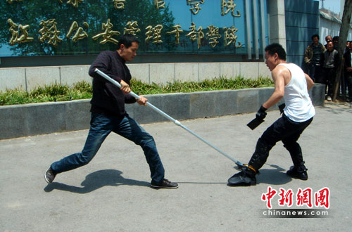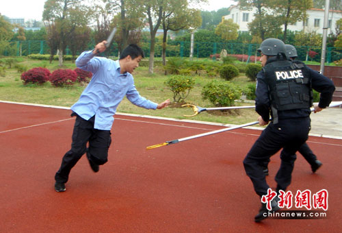 中新网南京5月7日电(朱晓颖)长杆可伸长至1.98米,头上“长钳”,轻轻触碰到人体部位钳叉自动收缩扣紧,在按钮作用下锁扣弹开……7日上午,在江苏警官学院,记者看到这个叫做“应急防卫抓捕器”、专门制服持刀歹徒的新发明,它的发明者是该院警体部战术教研室主任周祥兴及其学生谢理。