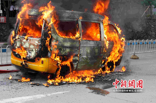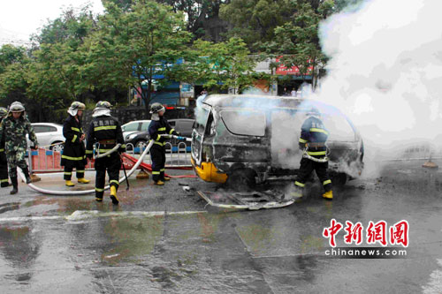 中新网宜昌5月7日电(郭晓莹 王申)5月7日下午,湖北省宜昌市一辆黄色面包车失火,消防官兵接到报警后迅速赶到现场将火扑灭。