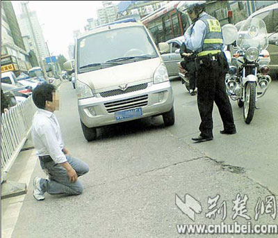 目击者杨先生称,前日上午10时39分,他路过中南路中南商业大楼门前时,看到一辆面包车被交警拦下后,男司机一下车就跪倒在地上说:“我错了,请给一次机会。”(如图)交警马上上前将司机拉起来,希望他不要激动。不料司机被拉起来后,再次跪倒在交警面前。交警不断劝说,司机才站起身,将驾照交到交警手上,跟随交警回大队接受处理。