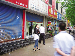 他随后从店里跑到门口想看个究竟,只见两个警察蹲了下来,用手去抬卷帘门,结果轻轻一抬卷帘门就“哗啦”一声升上去了,他连忙跟着两个警察跑进去,眼前的景像让他大吃一惊,只见先前在店里值班的小姑娘瘫坐在地上,脸色煞白,嘴里说,“那人有刀,那人有刀。”他还想继续看,但被警察赶了出去。“后来听说是抢劫,但事先我一点声音都没听到啊,店里也干干净净的,不像遭到抢劫的样子,真是怪了,而且她说有刀,应该不是麻醉抢劫啊,否则用刀干嘛呢,搞不好是被刀吓瘫的吧”,鲜花店老板说。