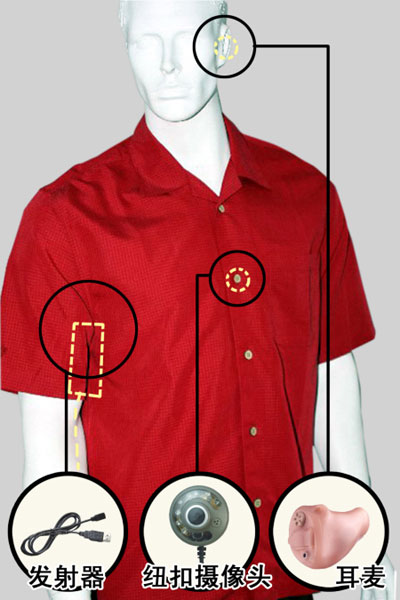作弊考生进考场前,要带上电子遥控设备、米粒耳麦,穿上安装有针孔摄像头的衣服。