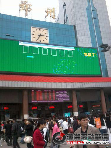 5月16日下午两点10分左右,郑州火车站户外电子屏上意外“上演”纸牌游戏,引起不少人围观拍照。