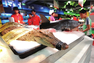 昨天,记者提出看超市出售鳄鱼的相关证明,永辉超市的前台负责人刘先生称,超市从农贸市场购进了鳄鱼和鲨鱼,对方都提供了检疫报告和许可证,“卖方提供相关证明,我们就能进货公开销售,超市不需要提供证明”。 (记者王奕)