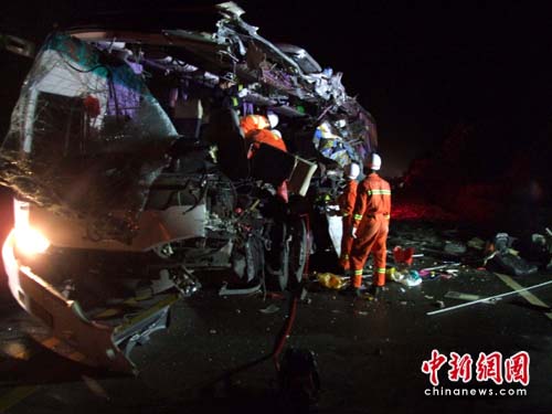 中新网河池5月24日电(叶大勇 李勤政 吕坤城)24日凌晨1时,广西河池市国道050线3080米至3090米处(保平路段)发生一起特大交通事故,一辆由南宁往金城江(桂MA3308)的卧铺客车与一辆由四川达州往广东宝山(粤BC0607)的长途客车迎头相撞。据统计,目前事故已造成10人当场死亡,2人送医院抢救无效死亡,35人不同程度受伤,其中重伤1人。