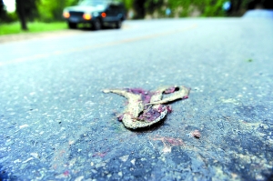 “这里埋着好多被轧死的蛇”,昨日,村民李女士拿着树枝,戳了戳刚翻新的几堆土,有的土堆随即露出蛇头。李女士说,5月22日上午8时许,她坐936路公交经过此处,突然有人喊了一声“是不是碰见蛇窝了”,她往窗外看去,只见马路中间、两侧,大量蛇在蠕动。