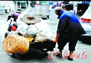 在穿梭的车流中,陈老伯弓着腰,吃力地拉着歪歪扭扭的平板车在大马路上缓慢前行,车辆在他身边飞驰而过,老人究竟要去哪里呀?“我要拉去清新县迳口,要走3个小时啊,”从老伯含糊不清的言语中,记者得知,原来这对年龄加起来160岁的老夫妻每天凌晨3时多就要起身,从20多公里外的城郊拉车徒步进城,到了市场已经天亮,接着他们分头去拣一些烂菜叶等装好车,再一路拉回去喂猪,到了家里已是月上梢头。一个8旬老伯拉着平板车从松岗市场去清新迳口,就算是一个正常人行路,也要走几个小时,别说是拉车了。陈伯的举动吸引了不少人的好奇的目光,他为何要这样折磨自己啊?