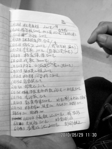 李秀琼随身携带的笔记本上,一笔一笔地记下了借钱和捐钱人的名字和电话,没有名字的,就用地名代替,比如“苏州”、“通江”等。