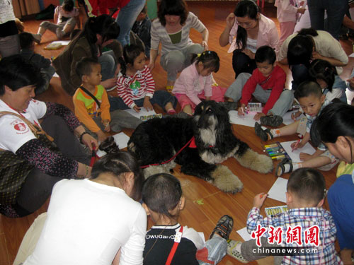 中新网成都5月31日电(何雨芯 吴晟炜)31日下午,四川省聋儿康复中心迎来了一批特别的客人——亚洲动物基金可爱的狗医生们。在“六一”儿童节来临之际,狗医生大尔、猪油和贝贝给小朋友们带来了“六一”节的礼物,也为孩子们送去了欢乐。
