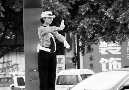 照片内容大同小异:在一个路口岗亭,一名“全副武装”的女交警,变换着手势,指挥过往车辆和行人通行。