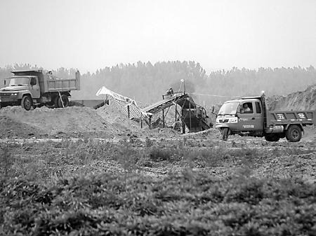 耕地已被毁,机械穿梭忙,振动筛正在向车上装沙