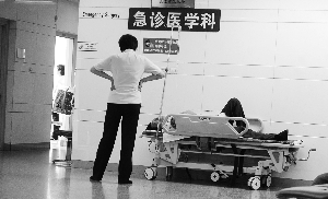 昨日中午,海淀医院一楼大厅内,50多岁的郝某被安置在一张临时床位上,左手腕缠绕的纱布几乎被血渗透,灰色衬衣遍布血迹,一位自称是其邻居的李女士在旁陪同。