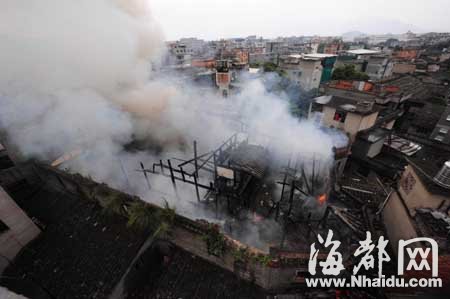 起火的是福州仓山区盖山镇郭宅村一栋砖木结构的民宅,共两层楼,单层面积约500平方米,已有上百年历史,平时里面只住着两户人家。